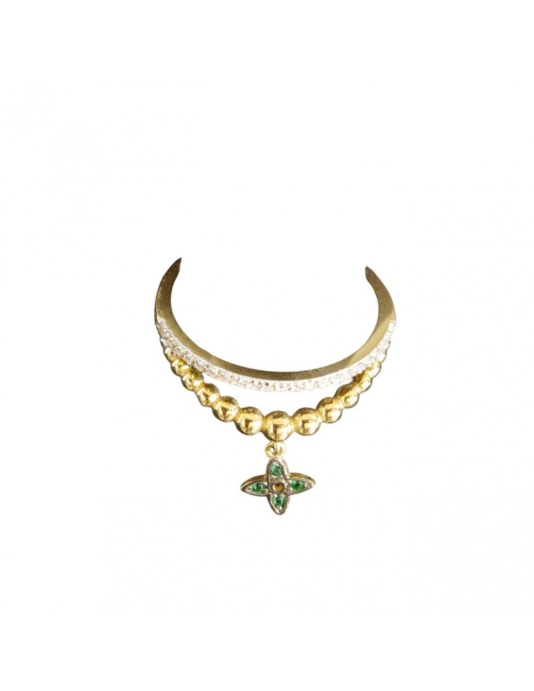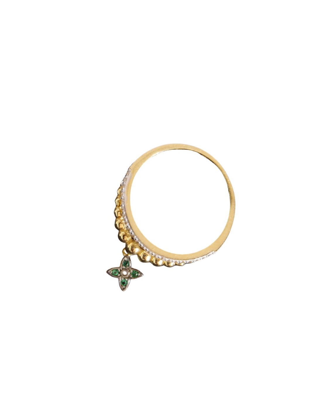 L'anello del Rosario totalmente in Oro 18 kt è un gioiello di grande eleganza e raffinatezza che non passa inosservato. Incastro a mano con pietre bianche nella parte superiore e sul piccolo pendente pietre verdi, questo anello è un vero capolavoro di artigianalità artistica.
