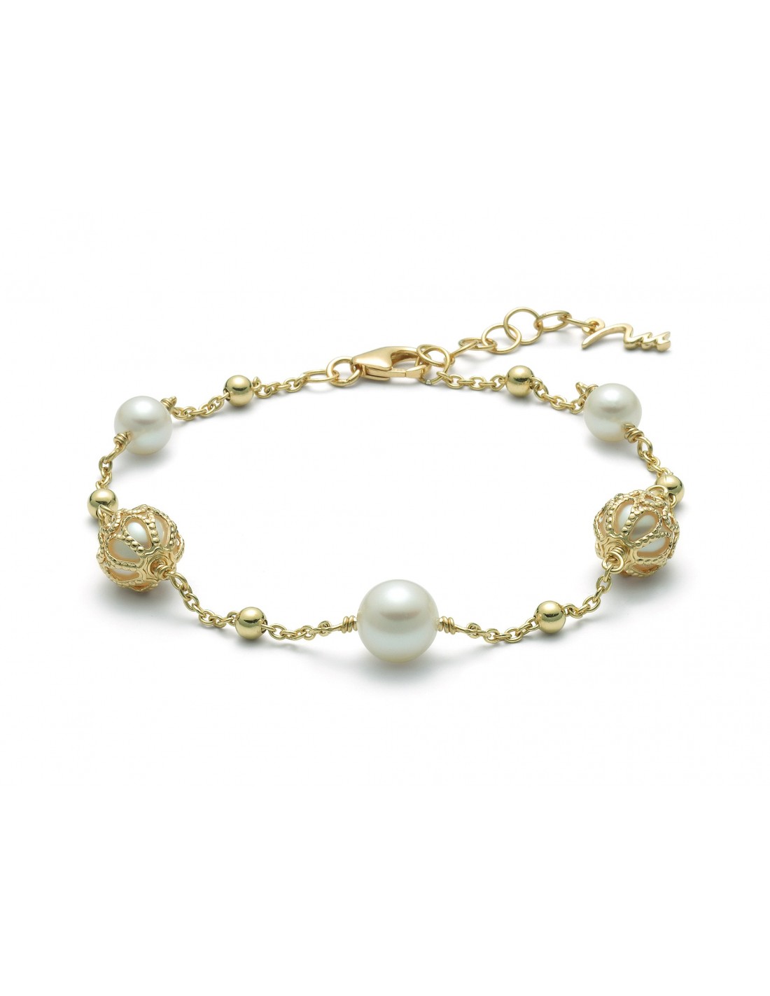 Il Bracciale Miluna Perle Ingabbiate Dorato è il gioiello perfetto per chi cerca stile e raffinatezza. Realizzato in Argento 925/1000, questo bracciale presenta ben cinque perle vere di coltura di varie dimensioni e tutte colorate in bianco, ciascuna ingabbiata in una struttura dorata che le valorizza al massimo. Le perle hanno un diametro che va dai 5.5 ai 8 mm, rendendo questo gioiello versatile