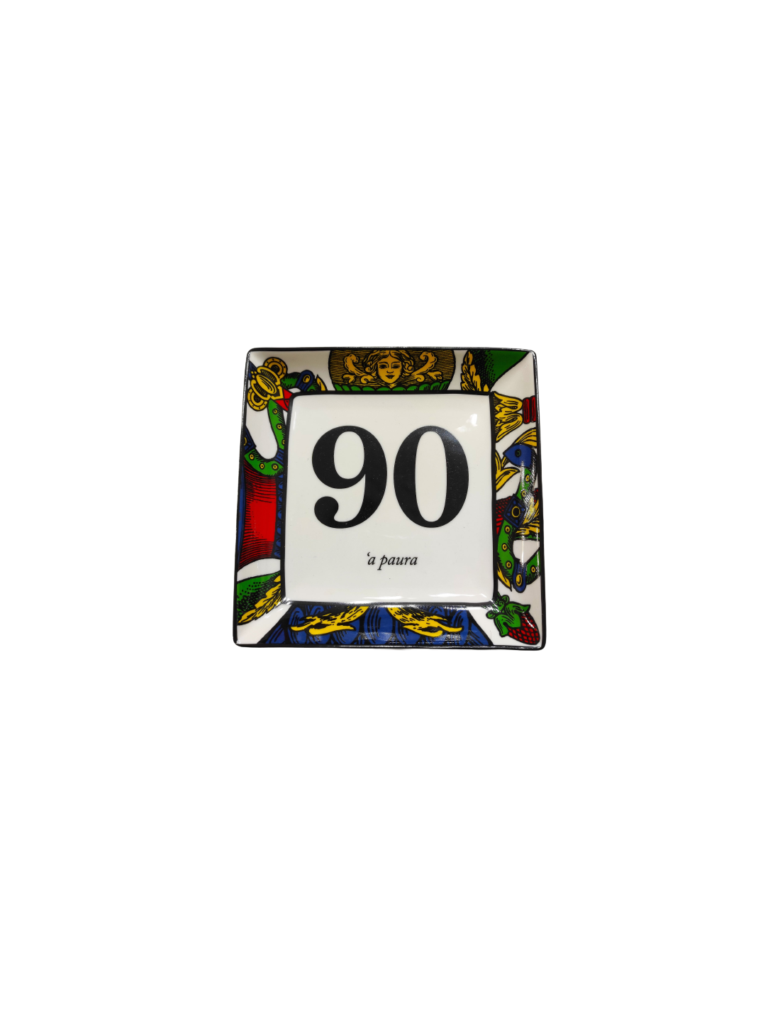 Emò Italia - Svuotatasche Smorfia Napoletana in Porcellana Lo svuotatasche ironico in porcellana linea Smorfia napoletana si ispira alle credenze popolari partenopee. Il soprammobile utile ed ironico reca al centro il numero 90 , ' A' Paura' ironicamente indicata come scacciaguai ed in funzione scaramantica. Idea regalo simpatica per amici e parenti un po’ sbadati che sono soliti perdere e ritrov