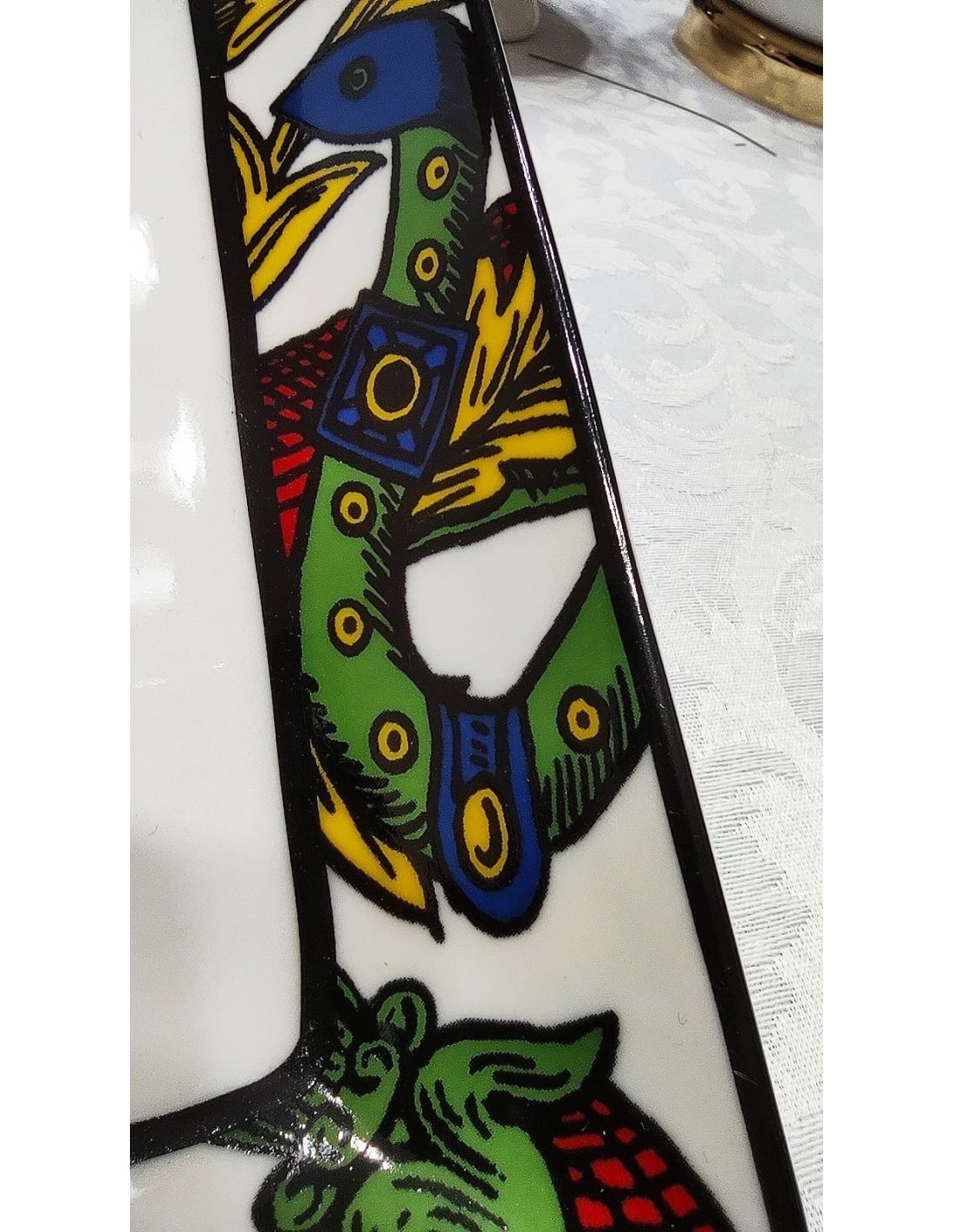 Lo svuotatasche ironico in porcellana linea Smorfia napoletana si ispira alle credenze popolari partenopee. Il soprammobile utile ed ironico reca al centro il numero 90 , ' A' Paura' ironicamente indicata come scacciaguai ed in funzione scaramantica. Idea regalo simpatica per amici e parenti un po’ sbadati che sono soliti perdere e ritrovare oggetti in casa! Finemente lavorata nei minimi dettagli , rappresentati gli Assi delle carte napoletane : Denari , Bastoni , Spade e Coppe , un oggetto unico e speciale.