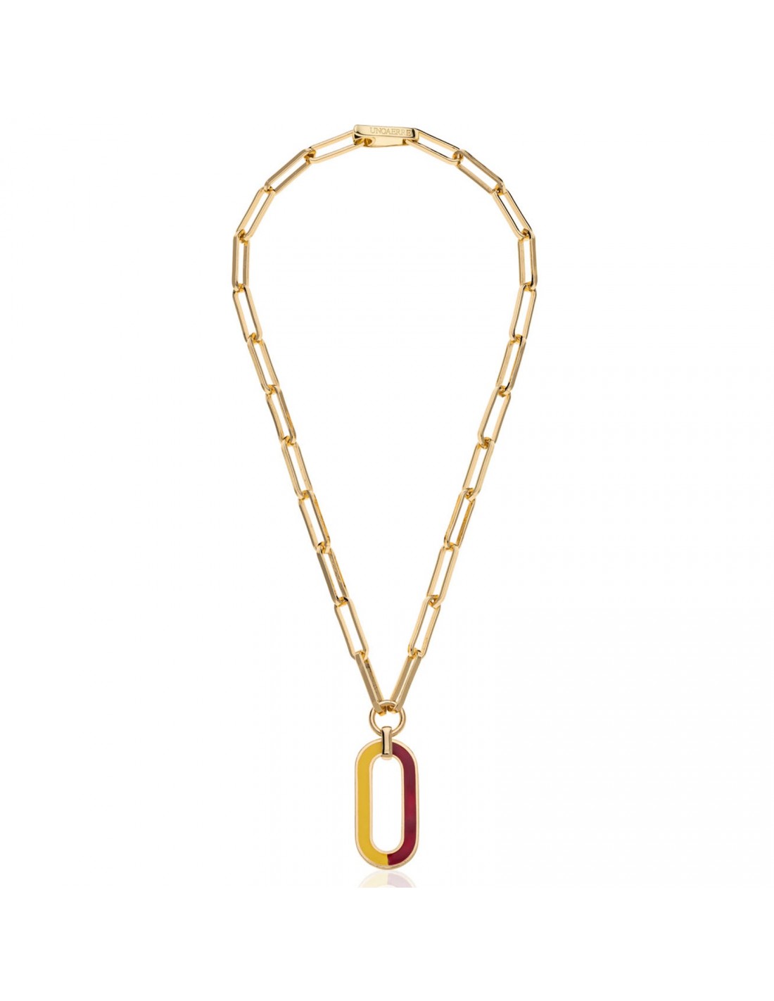 La collana con pendente smaltato rosso e giallo di UnoAerre è un gioiello dal design dinamico e dall'esclusivo mood vintage. La catena, lunga 50 cm e rifinita con un bagno in oro, sostiene un grande pendente smaltato nei colori rosso bordeaux e giallo. Un'esplosione di stile che ti consente di esaltare ogni outfit, dal casual all'elegante. Completa il look con gli altri gioielli della collezione Unoaerre Holi.