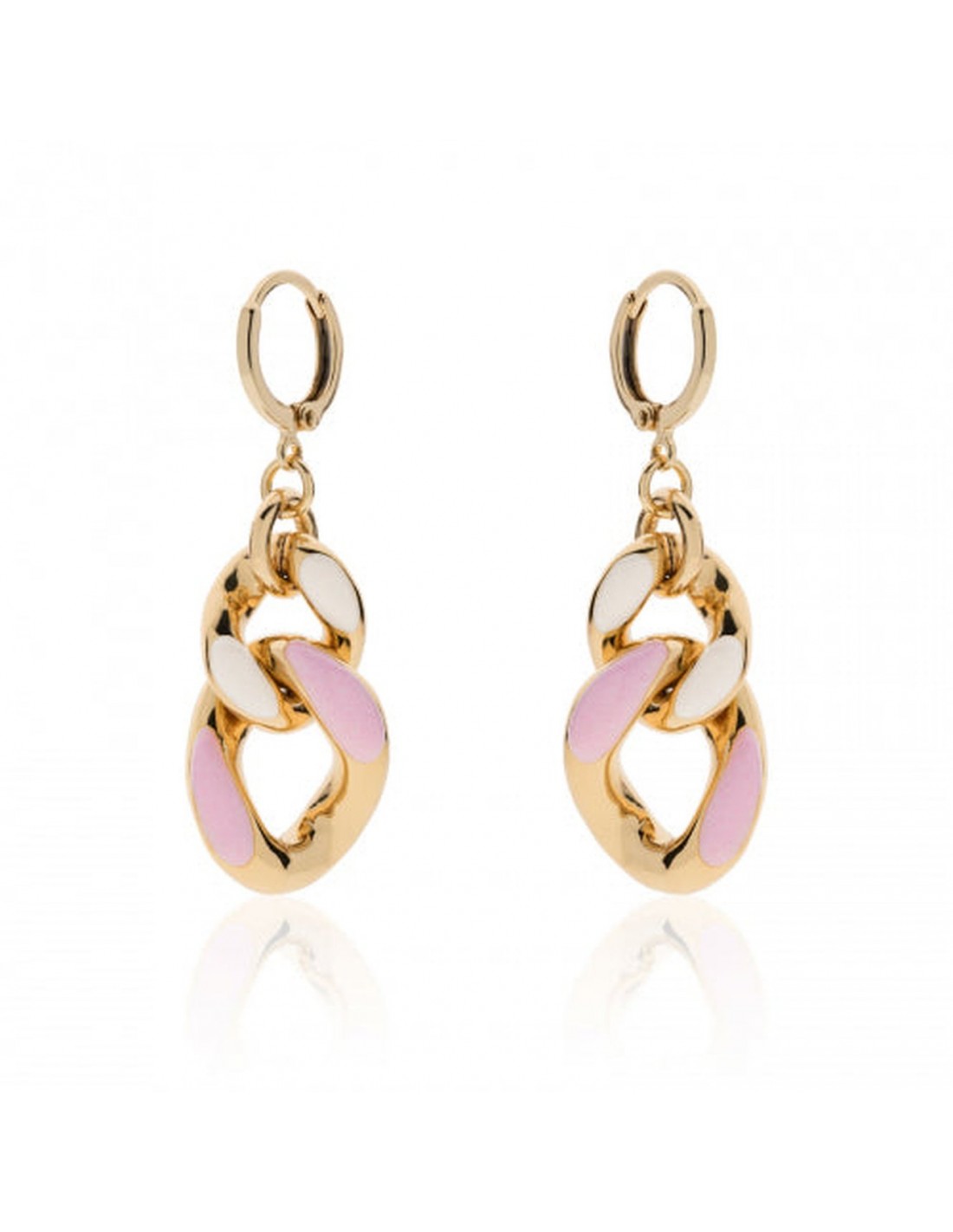 Gli orecchini in bronzo dorato con catena grumetta e smalto rosa e bianco sono un accessorio gioiello dal design fluido ed elegante al vivace tocco di colore. Adatti ad ogni occasione, questi orecchini sono il compagno perfetto 24 ore su 24, 7 giorni su 7. L'accostamento di tonalità delicate di rosa e bianco conferiscono ad essi un'aria femminile e romantica.