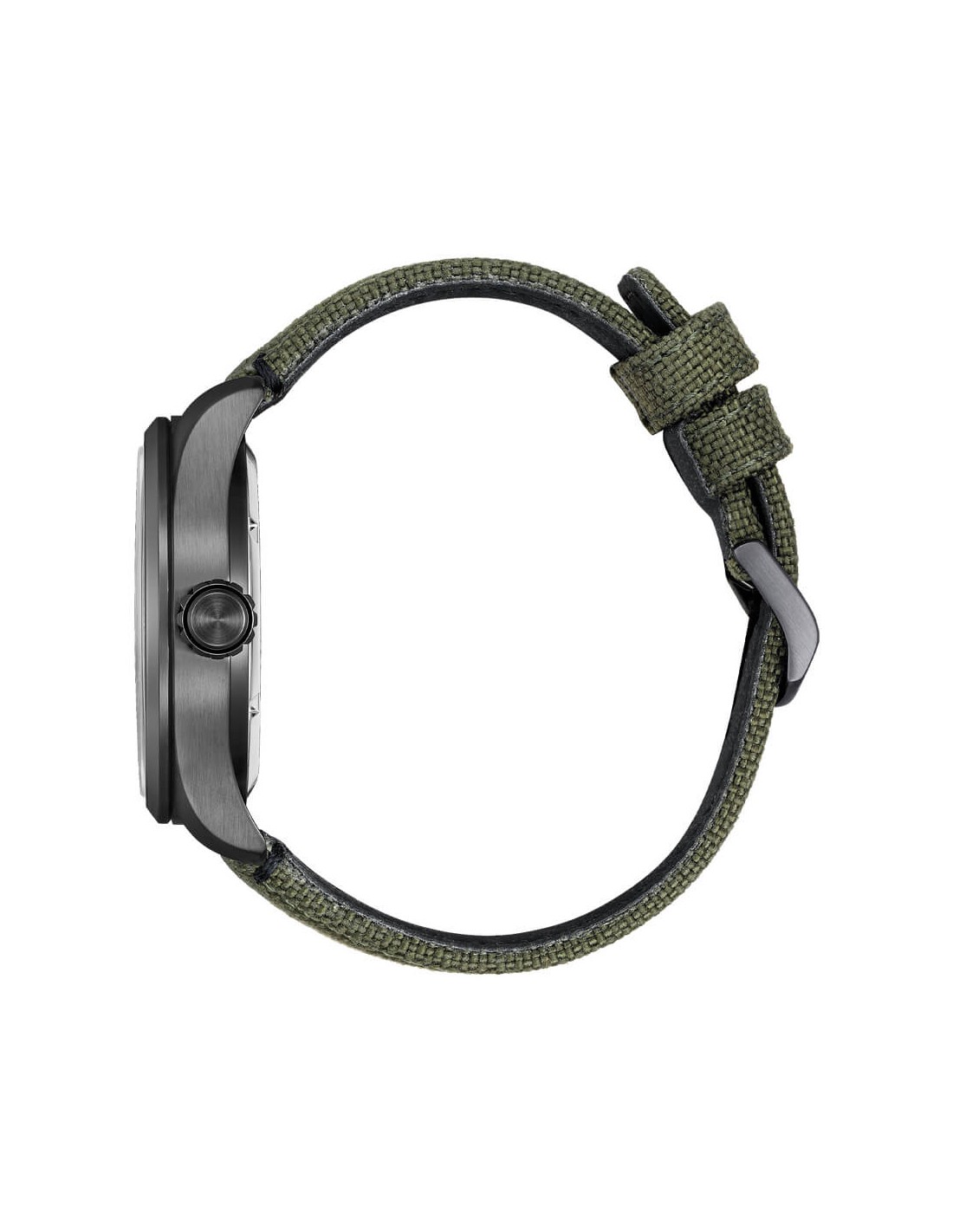 Il design sobrio e raffinato caratterizzato da un quadrante grigio antracite con dettagli arancioni offre un contrasto accattivante che cattura l'occhio, mentre il cinturino in tessuto verde è confortevole ed esteticamente gradevole.